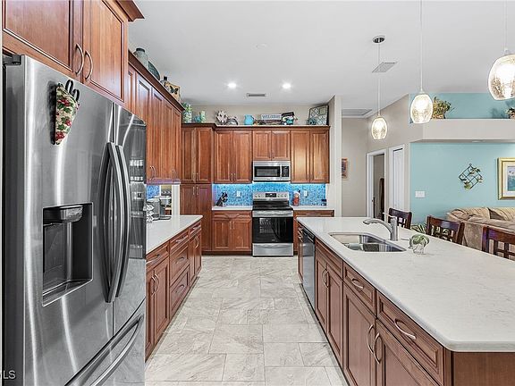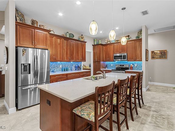 Custom built sprawling one level living pool home over 2500 Sq Ft and 3400 total living space. Well maintained 3 BR + den, 2 BA, 3 car attached garage. Totally updated kitchen with upgraded SS appliances, quartz countertops, huge island open to dining and great room. Custom built bar area for entertaining. 10' Ceilings make the home light and airy. Spacious Primary suite with sitting area leads to your private oasis. Primary bath has two vanities and a jacuzzi tub with updated walk in shower. Split floor plan with two nice size bedrooms and guest bath for privacy. Nice den also. Tiled flooring throughout. The large screened lanai (newly tiled) with undercover area, concrete heated pool and spa make this a private retreat with reserve and at end of street. 3 car attached garage with ample storage along with large shed. Roof installed 7/16, new water and pool heater. Kitchen remodel 2020. This development has No HOA and flood insurance not required by FEMA. You may bring your boat or RV. Wonderful friendly neighborhood. This development is centrally located to RSW Airport, hospitals, shopping, dining and award winning sugar sand beaches