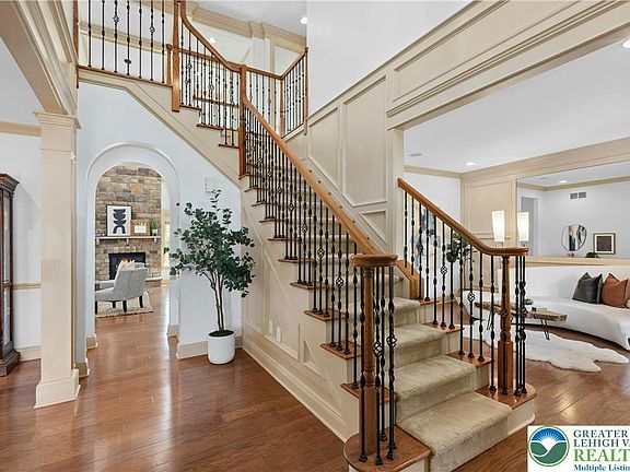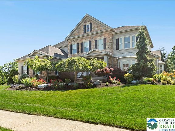 Built as the model home in a sought after Lehigh Valley neighborhood, this elegant colonial is distinguished by luxury upgrades, exceptional appointments, soaring ceilings & ample space for multi-generational living. Over 5,900 sqft of living space on 3 levels encompasses 6 BRs & 4.5 bathrooms. A symphony of arches & architectural elements welcome you in the 2 story foyer. Hardwood floors flow into a great room that is pure drama with massive stone floor-to-cathedral-ceiling fireplace & oversized 2025 chandelier. An adjacent luxury kitchen is impeccably designed with granite counters, high-end stainless appliances & island seating. The breakfast room captures the morning sun with walls of windows & vaulted ceiling. A convenient 1st floor BR with ensuite bath also enjoys the high ceilings, extra-tall wood doors, & hardwood floors found throughout the 1st floor. Indulge yourself in the comfort & splendor of the primary suite with coffered ceiling, sitting room, dual walk-in closets & marble bath. 3 additional BRs & full bath complete the 2nd level. The windowed lower level offers an accommodating living space perfect for in-laws, grown children & au pairs. A private entrance from the drive leads to a large living room, kitchen, BR, bath, & office area. The premium 1 acre lot offers sweeping lawns with room for sports & a substantial Trex deck. Set in an enclave of luxury homes with sidewalks, quiet roads & a nearby park & conveniently located within minutes of Rts 22 & 78.