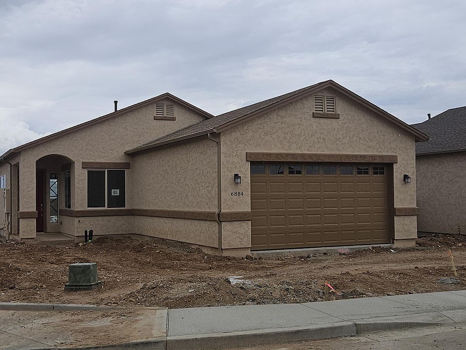 This home has an anticipated completion date of November 2025. Popular 503 plan. 2 tone paint. Upgraded staggered cabinets with granite counters and beautiful backsplash. All cabinets have door/drawer hardware. Luxury plank floors throughout, no carpet. Single bowl kitchen sink with an upgraded faucet. Front yard landscaping on a drip system and timer. 4 foot extension on garage with epoxy coating and paver drive and walk way. VIRTUAL TOUR IS OF THE MODEL HOME