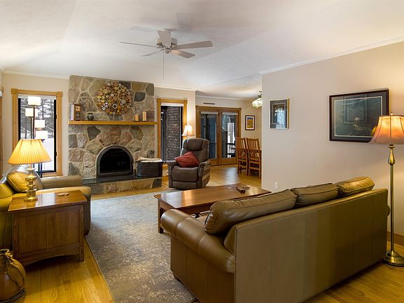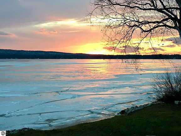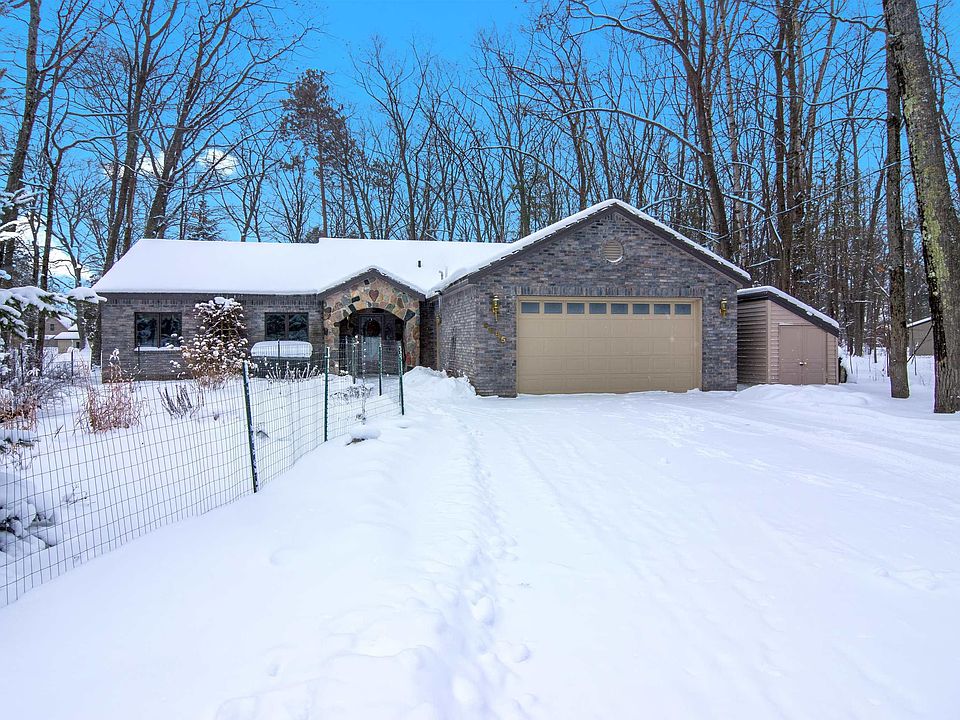 The natural beauty of Big Platte Lake waterfront and a stone mason’s artistry combine to make this spacious ranch home a one-of-a-kind offering. Your private 10 ft. access on the lake’s sandy west end provides a convenient spot to swim, paddleboard, kayak, and moor your boat offshore. Enter this 4 BR, 3.5 BA home under a stone archway inlaid with a cut-stone heart. Follow the oak floor into the living room with natural fieldstone fireplace, dining area with screened porch entry, and kitchen with eat-in dining, granite counters and updated appliances. Three carpeted bedrooms on the main floor include a primary bedroom suite with a full bathroom with jacuzzi tub. One bedroom with an outside door makes an ideal place for your office or home business. A tiled laundry/mudroom, a second full bath, and a half bath near the garage complete the home’s main level living. The finished lower level includes a family room with a fieldstone gas fireplace and wood ceiling, a bedroom with an egress window, and a bathroom with a custom tiled shower. A workshop area will please the DIYers and tinkerers. Keep your favorite vintages in the wine/pantry cold storage room. Stash your household equipment and supplies in the utility/storage room. Large storage closets in the family room await your seasonal gear, housewares and holiday décor. The attached screened porch with a metal roof includes an attractive vaulted ceiling design and wood floor. The home boasts an aluminum roof with a forever guarantee, wiring for the included generator, and pull-down steps to the garage attic. Outdoor spaces feature Trex decking off the primary BR, a flagstone patio off the porch, and landscaping and flower gardens. Follow a walkway to the private lake access to enjoy all water sports. The sunsets here will amaze you! From here, it's a Platte River paddle or a pleasant drive to nearby Lake Michigan and Sleeping Bear Dunes National Lakeshore Park.