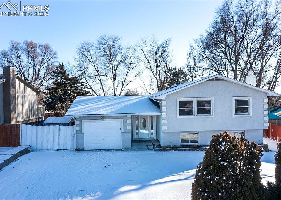Welcome to this spacious 5-bedroom, 3-bath stucco bi-level home with nearly 2,400 sq. ft. of living space. Ideally located across from King Elementary School and close to shopping, this property features a one-car garage with ample parking. The bright and open layout includes a large living room, family room, and a versatile bonus room perfect as a non-conforming bedroom or office. The kitchen boasts granite countertops, while a cozy brick wood-burning fireplace enhances the lower living area. Recent updates include new carpet in the lower level and wood laminate flooring on the upper level. The large, fenced backyard offers plenty of space for hosting and pets and has direct access from the house, and a storage shed for added convenience. Move-in ready with a solid roof, this home has great potential and is priced to sell. While it could use a little TLC, it offers exceptional value for its size. Great views of Pikes Peak and the Front Range from the upper living room! Don’t miss out—schedule your showing today!