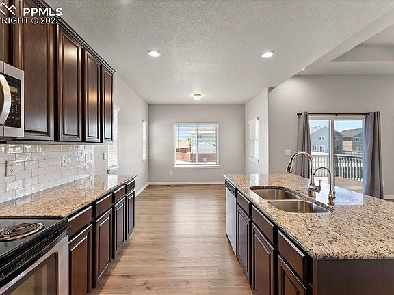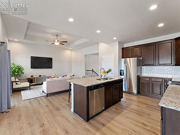 Spacious Ranch-Style Home with Dual Primary Suites and Mountain & Open Space Views! Welcome to this beautifully upgraded main-level-iiving floor plan with a full basement offering over 3,400 square feet of thoughtfully designed function and luxury. Perfectly situated on a premium corner lot open space adjacent to land that can never be built on, this home offers both privacy and breathtaking Mountain Views from the walk-out deck. Featuring 5 bedrooms and 4 bathrooms, including 2 luxurious primary suites—one on the main level and another on the lower level—each complete with spacious bathrooms and oversized closets, this layout is ideal for multigenerational living or long-term guests. Inside, enjoy the warmth of wood laminate flooring, upgraded kitchen cabinetry, and an open-concept living room that seamlessly connects to a formal dining area that can easily double as a home office or flex space. Downstairs, the full garden-level basement is flooded with natural light and includes additional bedrooms, living space, and a second primary suite making it feel like a second home within a home. Additional highlights include: 3-car garage-Large lower level storage area-New roof to be installed prior to closing-25 year structural warranty-10 year landscaping warranty-Easy commute to Fort Carson-Schriever, and Peterson. Don’t miss your chance to own this versatile and value-packed home.