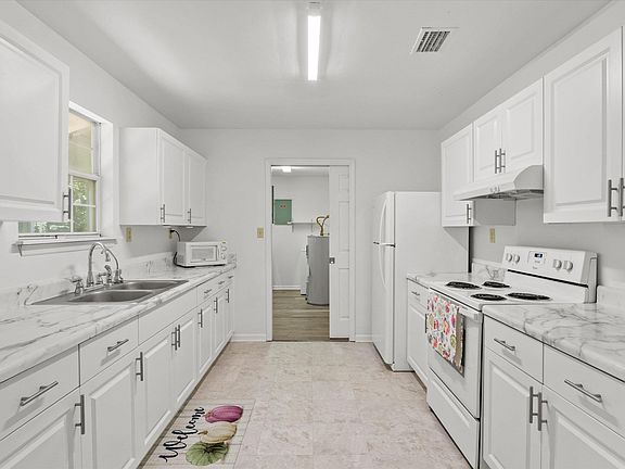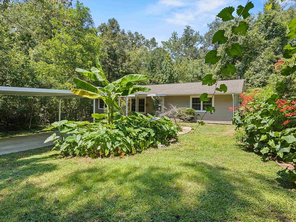 Discover your own private retreat on a full acre of land with a secluded driveway and beautiful natural surroundings. This property is the perfect blend of comfort and serenity—featuring a picturesque pond with a fountain, lush landscaping, and vibrant flowers and trees that attract butterflies and songbirds year-round. Enjoy relaxing mornings on the covered front porch or unwind in the screened-in back porch, all while taking in the peaceful views. Practical updates include a new HVAC (2021), roof (2017), a built-in home generator, and a covered carport for convenience and peace of mind. Inside, the bright and open split floor plan is designed for easy living. Two spacious guest bedrooms and a full bathroom are located on one side of the home, while the private primary suite with its own bathroom is set on the other. The large kitchen is warm and inviting—perfect for family meals or entertaining friends. A washer and dryer are included, making this home truly move-in ready. With affordability, space, and charm all in one, this property is an incredible opportunity for anyone looking for a private haven. Home is USDA eligible (0% down)