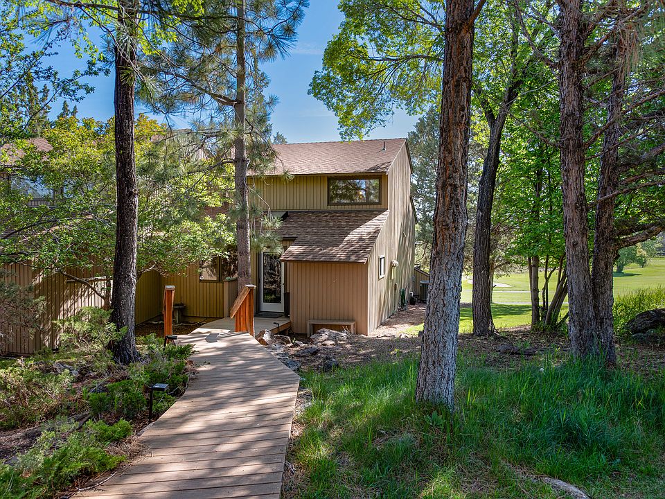 Immerse yourself in a haven of relaxation and luxury at this Eagle Crest Townhome. Step into the open living room, where vaulted ceilings, a cozy wood fireplace, and floor-to-ceiling windows create an inviting atmosphere, offering stunning, uninterrupted views of the lush golf course. Wake up to serene mornings in the exquisite master suite, which opens onto a private deck perfect for enjoying your morning coffee while soaking in the tranquility.