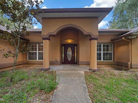 Opportunity is knocking! Welcome to your own slice of heaven, located in the charming rolling Hills of Ocala. This spacious 4 bedroom 3 bathroom home offers tons of potential, private fenced in acreage, and an updated roof/air-conditioning system. This diamond in a rough could use a good polish and it would be a fantastic home for the next 50 years. The desirable triple split layout offers the primary suite at one corner of the home, an additional en suite bedroom in an opposing corner, and two bedrooms that are spacious and share a bathroom at the front of the home. Formal living room, dining room, and a separate eat in kitchen area offer tons of living space in addition to the open concept, family room with beautiful French doors leading to the backyard. The covered patio is oversized and offers ample space for living and dining room set ups. Offering nearly 1.5 acres of land, this beautiful corner lot is fully fenced in with a separate fencing for a dog run area. There is a shed on the property, a spacious garage, a generator system that is under warranty until 2031 and an on-site water treatment system. With a little love and personal touch this could definitely be a beautiful home. Don't wait to jump on this opportunity, call today and make this your home!