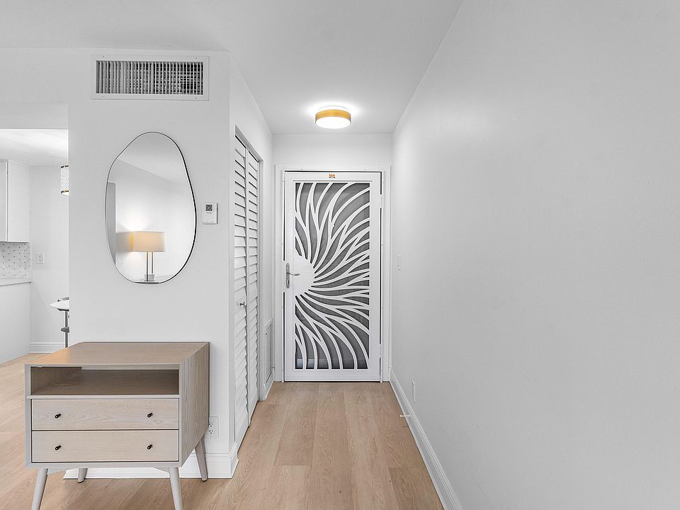 Experience waterfront living at its finest in this beautifully renovated penthouse on the Intracoastal. Filled with natural light throughout, this bright and airy one bedroom, one bath residence features a sleek walk-in shower and a spacious bedroom with plantation shutters framing exceptional water views, plus a generous walk-in closet with custom built-ins.A coastal-inspired custom bookshelf in the hallway leads to the primary bedroom, adding both charm and functionality. The thoughtfully designed kitchen showcases quartz countertops, a wall oven, open-concept shelving, and abundant cabinetry with drawer storage, all seamlessly flowing into the inviting eat-in dining area. The open living room captures sweeping water viewswatch boats glide in or enjoy the community kayaks launching from the dock. Step onto the screened-in balcony overlooking the tranquil nature preserve, the perfect setting for morning coffee or evening sunsets.