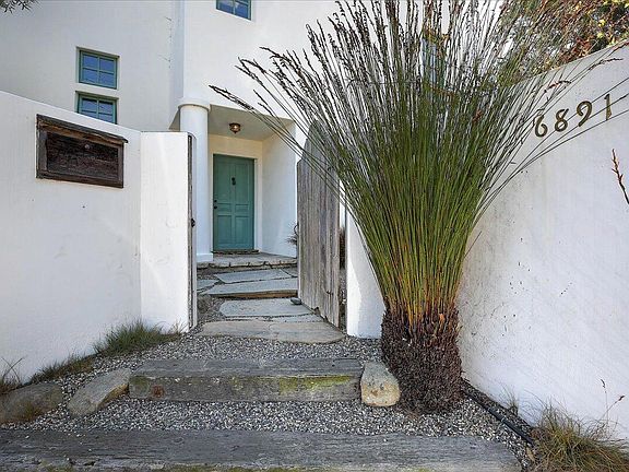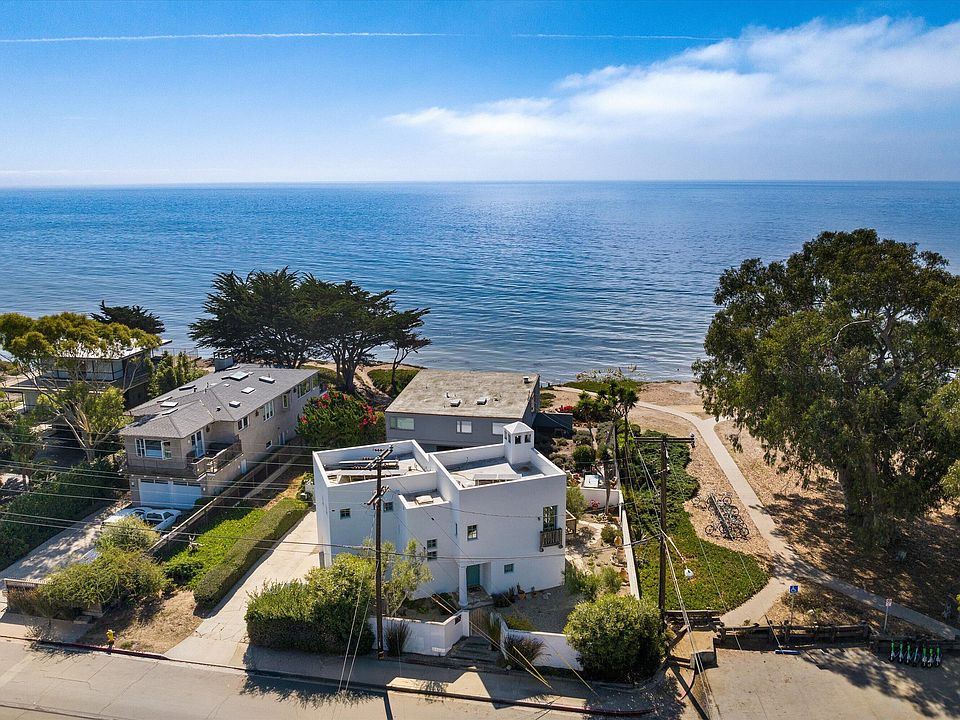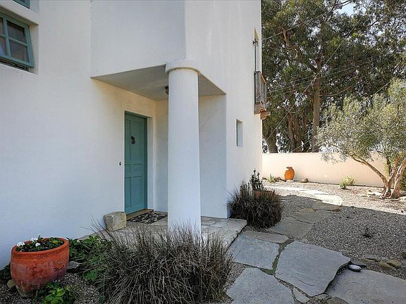 Contemporary Greek Island Style Home by Dennis Thompson ''green'' architect. Located in the residential section of Del Playa on the ocean bluff with Big Views. Exceptional handcrafted finishes & solid core furniture quality doors throughout. Two bedrooms 2 bath plus glassed in sunroom with beam ceiling & Two Offices. One bedroom & one office on the main level. Open island chef's Viking kitchen ideal for dining & casual entertaining. Attached two car garage with charger for EV. Adjacent to open space. A one-of-a-kind property!