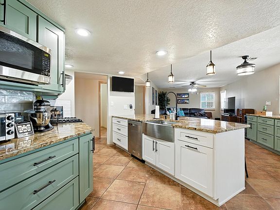 Beautifully updated 5BR home with a flexible floorplan and plenty of room to spread out! The downstairs suite works perfectly as an in-law space, office, gym, or playroom. The remodeled kitchen is a showstopper with a large seating bar, coffee station, walk-in pantry, and abundant storage. Multiple living areas plus a bright sunroom offer space to relax or entertain. The primary suite boasts a spa-like bath with walk-in shower and jetted tub. Enjoy a private backyard with 8' gate access, RV parking, and a Tuff Shed. Plenty of off-street parking up front for extra cars and room for an RV. Bonus: refrigerated air, newer water softener, and these appliances (fridge, stove, washer/dryer, chest freezer) included!