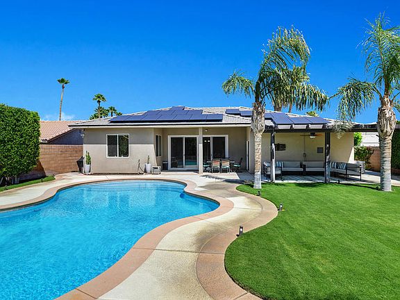Welcome to 68965 Hermosillo Road, a thoughtfully upgraded and meticulously maintained corner lot home located on fee land in Cathedral City's sought-after Panorama neighborhood. With nearby Panorama Park, Candy Cane Lane, the newly rebuilt Landau Elementary School (2025), and easy access to the I-10, this home blends comfort, style, and convenience for effortless desert living--all with no HOA.Inside, the open-concept layout is perfect for modern life, featuring solid core doors (2023), upgraded lighting, a custom-designed walk-in primary closet, and stylish ceiling fans throughout. The home has been smartly enhanced for energy efficiency, including owned 32 solar panels and a Tesla Powerwall, a water softener system (2022), and a 5-ton HVAC system (2024). The garage is equipped with its own AC split system and a Tesla EV charger, making it ideal for a gym, studio, or year-round workspace.Work your way outside to a private oasis with a sparkling pool and spa, a covered patio with an outdoor fan, and a refreshed misting system (2022). The backyard also features a rear gate with RV access and storage, offering rare flexibility for additional parking and desert toys.With clean finishes, functional upgrades, and a prime location close to shopping, dining, and everything the Coachella Valley has to offer, this property is truly move-in ready.