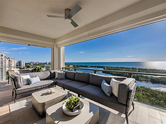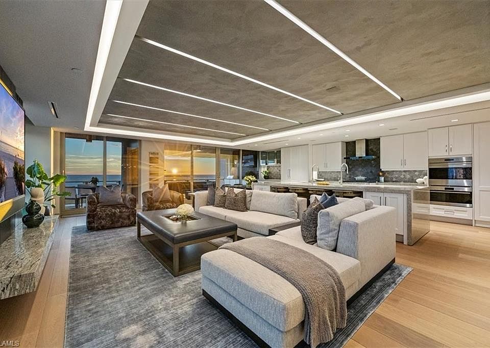 Welcome to 1701 Mystique, the crown jewel of Naples’ most prestigious high-rise, where custom craftsmanship and coastal sophistication meet on a grand scale. More than 5,500 square feet of reimagined living space capture sweeping views of the Gulf through floor-to-ceiling windows that flood the home with natural light. One of Naples’ rare condos offering a private three-car garage plus an additional deeded space — four coveted parking spots in total. Every element has been thoughtfully curated—from Legno Bastone flooring and Venetian plaster ceilings to bespoke millwork and hidden cabinetry that add architectural refinement throughout. The great room is anchored by a dramatic stone and hammered-metal fireplace wall and complemented by a dedicated wet-bar, lounge, and 392-bottle temperature-controlled wine room—an ideal setting for both entertaining and everyday living. The gourmet kitchen features Wolf and Sub-Zero appliances, gas cooking, quartz countertops, and a striking Black Panther Leather stone buffet that blends artistry and performance. A spacious lanai with hurricane shutters includes a lounge area, dining space, and built-in grill, seamlessly extending the kitchen and great room for effortless indoor-outdoor living. The primary suite is a serene retreat with breathtaking beach vistas, a spa-inspired bath, and custom-designed closets for both beauty and function. One of the four additional bedrooms serves as a private office with 180-degree golf course views, and a hidden closet concealed behind a wall of built-in cabinetry. Smart-home comforts include remote-controlled drapes and blackout blinds in all bedrooms, dual dryers, and private elevator access. Mystique offers a lifestyle beyond compare with 24-hour concierge and staff, a resort-style pool, private spa suites, theater, fitness and wellness center, billiards and social rooms, guest suites, and tennis courts—all within Pelican Bay’s exclusive beachfront community, featuring two private beachfront restaurants and proximity to Naples’ finest shopping, dining, and cultural destinations. This is more than a home—it is a statement of design, exclusivity, and modern coastal living at its highest level.