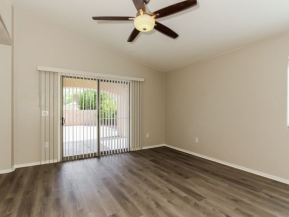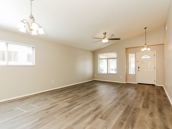 This renovated rental home in Tucson, Arizona provides a four-bedroom and two-bathroom open floor plan on one level. This 1,727-square-foot home features a two-car garage as well as a large fenced backyard with a covered patio. Vinyl plank flooring elongates the light-filled living room that features a ceiling fan, chandeliers, and bright windows. Enter the eat-in kitchen to find a set of shiny, stainless steel appliances surrounded by quartz countertops. The private bathroom in the master bedroom boasts a dual-sink vanity. Give us a call today to schedule a tour.
