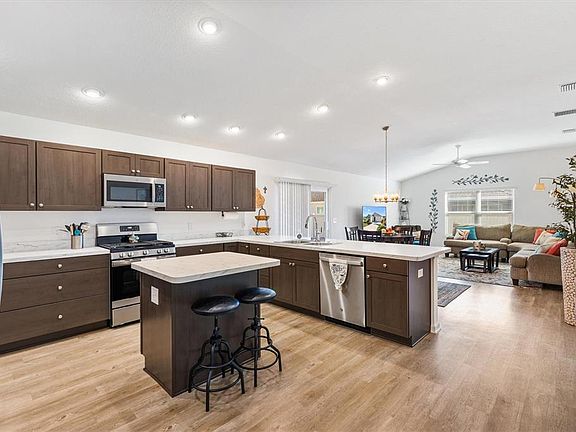 Built 2023 • Better Than New • Corner Lot with Dual Garages and Waterfall Feature Welcome to this Better-Than-New 2023 Moonstone Patio Villa in the Village of Lake Denham, The Villages, Florida. This 2-Bedroom, 2-Bathroom villa delivers modern design, quality upgrades, and low-maintenance living in one of The Villages’ most vibrant and newest neighborhoods. From the moment you arrive, curb appeal shines with a decorative driveway and corner lot that adds distinction and privacy. The property features two separate garages: an extended 1-car garage (12x16) plus a golf cart garage (10x9) offering ample storage and easy access for vehicles and golf carts alike. Step inside to a bright, open-concept floor plan highlighted by Luxury Vinyl Plank (LVP) flooring throughout the main living areas. The spacious kitchen showcases Shaker-style cabinetry, a working island with breakfast bar, stainless steel appliances, and a gas range that overlooks the living and dining spaces, creating a seamless flow ideal for entertaining. The Primary Suite provides a peaceful retreat with a walk-in closet, adjustable bed, and private ensuite bath featuring a dual-sink vanity, walk-in shower with sliding glass doors, and a separate toilet closet. The guest bedroom includes a built-in closet and easy access to the guest bath with a tub/shower combination. Additional interior highlights include a large storage closet, inside laundry area, and tasteful furnishings throughout, making this home turnkey (except smoker and golf cart) and gently lived in. Enjoy the Florida lifestyle year-round in the screened lanai, perfect for morning coffee or evening relaxation. Step outside to beautifully enhanced landscaping that includes a tranquil waterfall feature, extending the outdoor living area and adding a touch of serenity to your private corner setting. Practical upgrades and systems are already in place, with energy-efficient construction, natural gas utilities, and a modern design built to today’s standards. For added convenience, a 2023 4-seater golf cart is available for purchase outside of contract—an ideal way to explore The Villages in style. This prime Lake Denham location provides close proximity to numerous recreation and golf destinations: Mickylee Pitch & Putt (0.5 mi), Franklin Recreation Center (0.5 mi), Homestead Recreation Center (1.6 mi), Southern Oaks Championship Golf Course (2.5 mi), Laurel Oak Executive Golf Course (2.5 mi), Jubilee Putting Course (2.8 mi), and Eastport Town Square (4.9 mi). Combining newer construction, thoughtful upgrades, and a rare dual-garage configuration, this Moonstone Villa offers turnkey comfort, stylish finishes, and easy access to all that The Villages lifestyle provides.