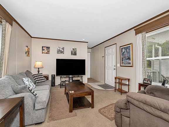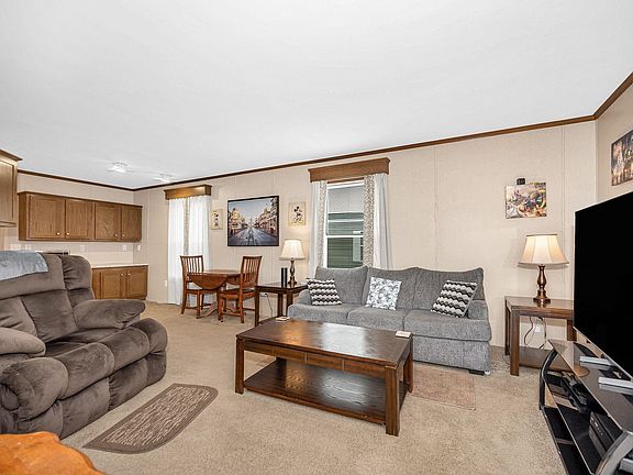 Step into this move in ready 2 bedroom, 2 bathroom home nestled in a peaceful and well-maintained 55+ Ackerman's community. As you arrive, you're welcomed by a freshly paved double driveway and a covered front porch, perfect for enjoying your morning coffee. Inside, the spacious and sunlit living room that flows effortlessly into a warm and inviting kitchen with rich wood cabinetry, ample counter space, and full-size appliances including a gas stove, dishwasher, microwave, and fridge. Just off the kitchen is a cozy dining area, ideal for casual meals or entertaining guests. Down the hall, the primary bedroom offers generous space, double closets, and a ceiling fan, along with a private en-suite bathroom that includes a walk-in shower, a stylish vanity, and built-in shelving for extra storage. The second bedroom is perfect for guests or a home office and sits beside a full bathroom with a tub and shower combo and tankless water heater. A dedicated laundry area with a washer, dryer, and built-in cabinetry leads to the back entrance. Outside, enjoy the level grassy yard, a sturdy storage shed, and the convenience of central A/C. This home combines low-maintenance living with everyday comfort in a welcoming community setting.