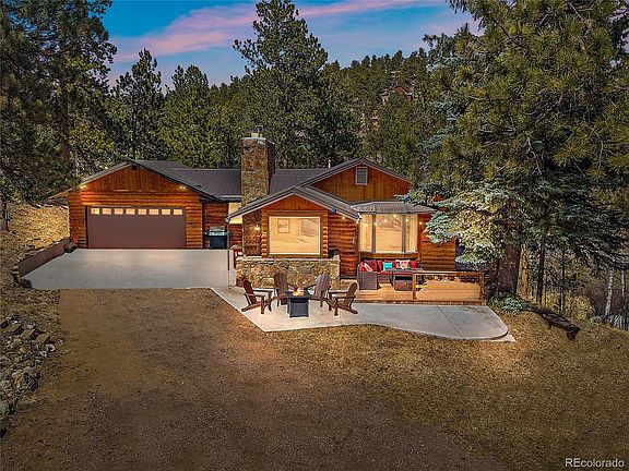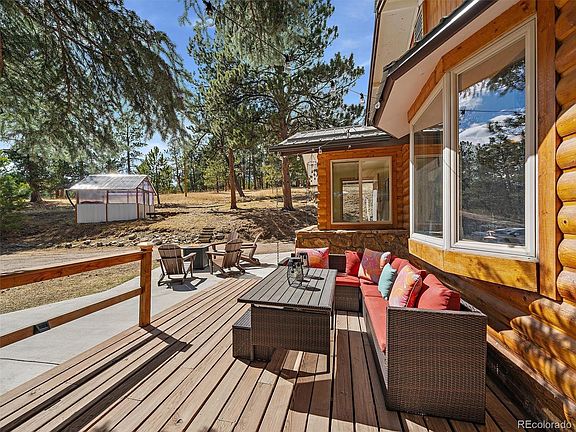 Experience Unparalleled Colorado Mountain Living! Welcome to your dream retreat! This stunning log-sided home is nestled on 6.56 acres of fully fenced, usable mountain property, offering the perfect blend of rustic charm and modern convenience. A gated entry, tranquil pond, wraparound deck, and new metal roof set the stage for a truly unique lifestyle. Inside, you’ll find vaulted ceilings, hardwood floors, and wood beam accents that create a warm and inviting atmosphere. The mudroom flows seamlessly into a cozy living room with a stone fireplace, perfect for those chilly Colorado evenings. The gourmet kitchen is a chef's delight, boasting new stainless steel appliances, beautiful alder cabinets, granite countertops, and a convenient breakfast bar. The main floor features two bright and spacious bedrooms, complemented by a spa-like bathroom with a walk-in shower and double vanity. The finished walkout lower level offers additional living space, including a third bedroom, a bonus area with a pellet stove, a laundry room, and a full bath complete with a relaxing jacuzzi tub. Outdoor enthusiasts will appreciate a stone chimney grill perfect for al fresco dining, a spacious patio for entertaining, charming greenhouse, as well as plenty of space to store RVs and ATVs. The attached two-car garage and detached one-car garage provide ample storage for your vehicles and equipment.