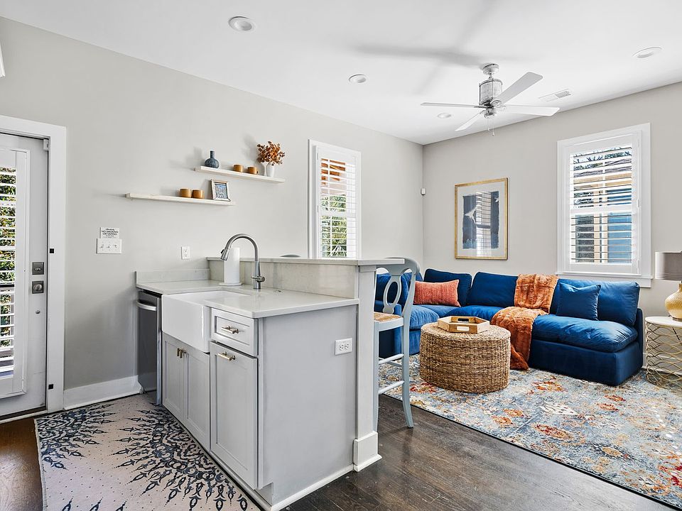 Step inside to a open living area with high ceilings, plentiful windows with shutters, and a cozy sectional sofa for relaxing after a day exploring the city. The kitchen features stainless steel appliances, bar seating for three, and everything you need for cooking at home. A washer and dryer are conveniently tucked away in the pantry closet.