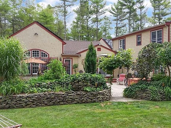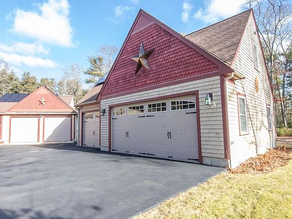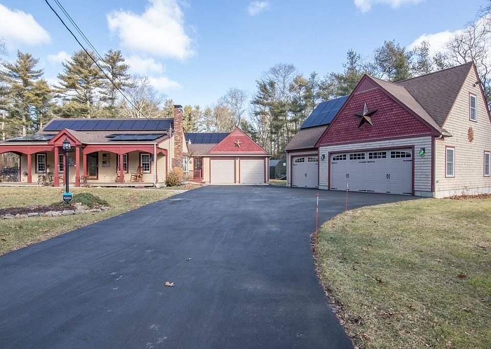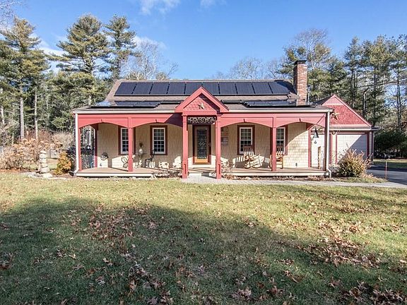 As you enter the front door from the cozy porch, you will immediately realize that this is not your average Cape style home. The entertainment sized dining room has post and beam style ceiling, fireplace w/woodstove insert, and hardwood floors. The kitchen was remodeled in 2018 with new granite counters and appliances. The huge library/great room has cathedral trussed ceiling with numerous built-ins, large gas fireplace, and walls of windows overlooking beautifully landscaped yard with garden shed and greenhouse. Two car attached garage and 3 car freestanding garage, both with storage above and plenty of parking space. The house comes with solar panels, owned not leased, that were installed in 2013. The energy that the solar panels generate reduces or eliminates the cost of electric used; they are guaranteed for 25 years, and on a quarterly basis you receive a check for energy generated that they buy back.