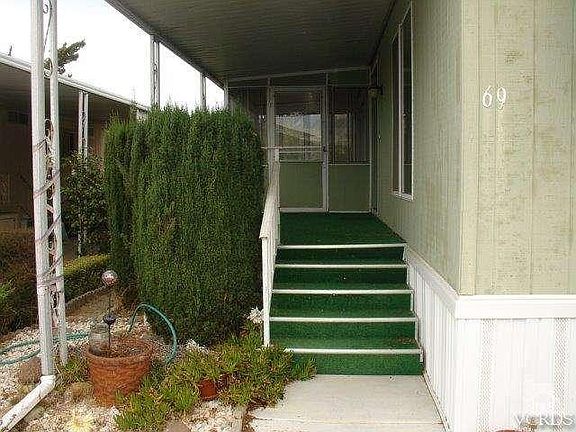 Ojai Villa coach close to club house, pool, and guest parking. Offering a nice yard with fruit trees, great for entertaining or pet. In need of some renovation but a great buy for someone with a vision and some skill. Enclosed porch adds extra space for office or hobby room. Master has sliding glass doors leading to spacious back yard and mountain views. Low space rent a real plus for those on a fixed income.