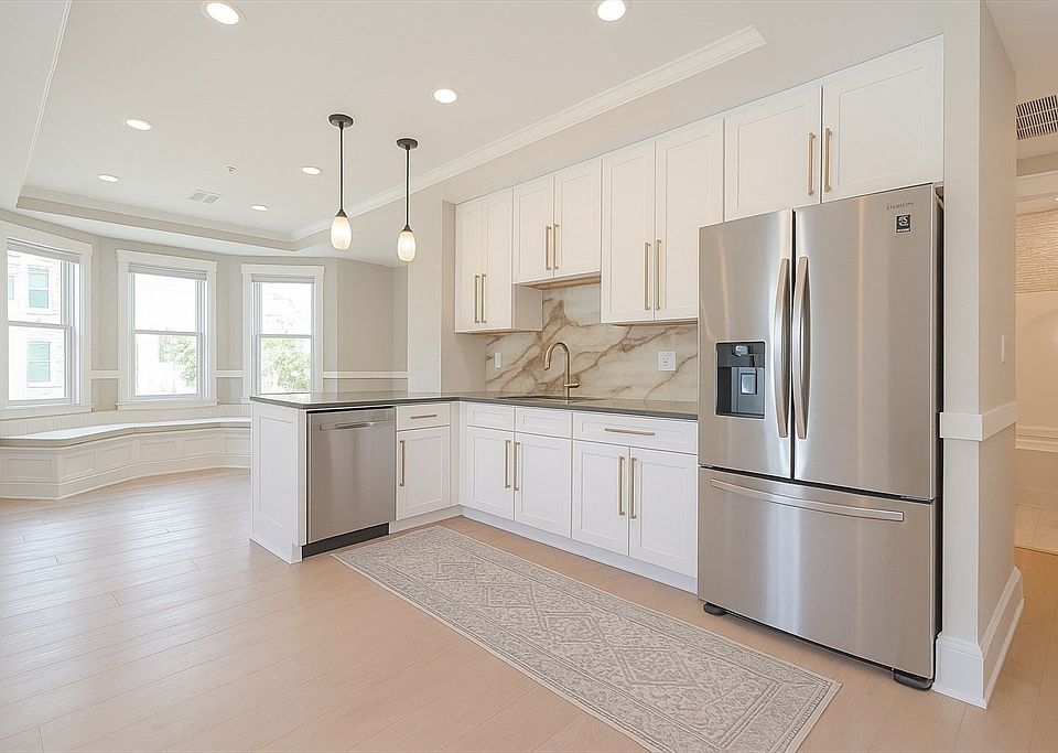 Inquire about 4.5% interest rate! Stunning 2021 renovation featuring 2 bedrooms and 2 full bathrooms in the heart of Eagle Hill. The open-concept kitchen, living, and dining area is perfect for entertaining, highlighted by a custom built banquette, high end stainless steel appliances, black quartz countertops, and white shaker cabinetry. The primary suite offers a walk-in closet with custom built-ins and a sleek, modern en-suite bath with a large walk-in shower. The oversized second bedroom provides ample flexibility, and the separate office space is ideal for working from home. Enjoy the convenience of a full-size in-unit laundry and a generous rear deck for outdoor living. Close to parks, restaurants, shopping, and the T, this home truly has it all!