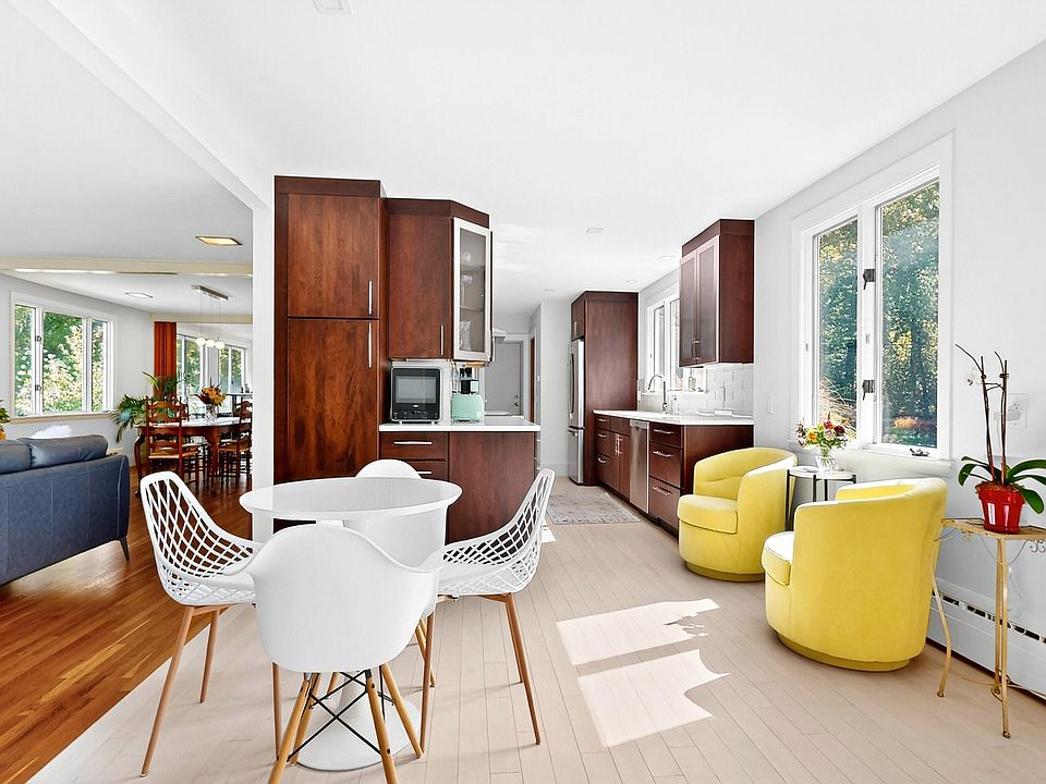 Open the door to 69 Falmouth Road, a serene mid-century modern retreat nestled on over 8 pastoral acres. Thoughtfully updated for effortless entertaining, this 2-3 bedroom, 2.5-bath home blends timeless design with contemporary comfort. Elevated to embrace sweeping views of the backyard and surrounding landscape, the single-level main floor invites natural light and tranquility. The heart of the home is a spacious great room with open concept living and dining areas, anchored by a cozy woodstove and framed by picture windows. The floor plan flows naturally to a chef-ready kitchen ideal for holiday gatherings. The generous primary suite offers warmth and versatility, with space for a reading nook or meditation corner. Original bathrooms add a splash of retro flair, stylish, fun, and full of personality. Additional main-floor highlights include a flexible office (or potential third bedroom), plus an expansive laundry, pantry, and mudroom area. Downstairs, follow the vintage ski wallpaper to a finished lower-level brimming with possibilities: family room, game room, gym, studio, workshop, you decide. A wall of windows opens to a stunning walk-out patio, surrounded by lush, seasonal landscaping that blurs the line between indoors and out. Dreaming of a private spa oasis? There's room for a sauna, hot tub, or pool in this secret garden sanctuary. Explore your own nature trails that connect directly to the Falmouth Land Trust network. The property offers flexibility with potential to divide the land or keep it intact. Hobbyists will be elated with an oversized attached 2-car garage plus a separate 4-car garage, perfect for vehicles, gear, or creative pursuits. This is more than a home, it's a lifestyle. Come experience the magic of 69 Falmouth Road.