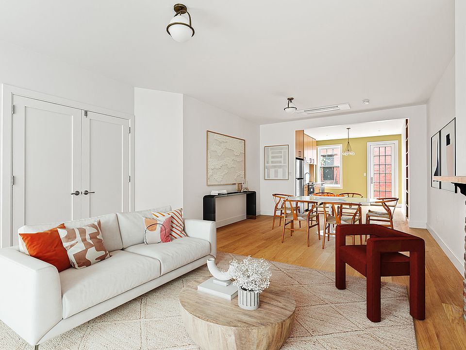 The parlor level features an open living / dining space accented by a ventless Hearth fireplace, a custom eat-in kitchen with direct yard access, and a powder room.