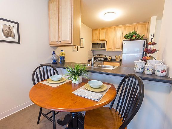One or two bedroom apartments include an open floor plan with kitchen, living/dining room, and spacious bathroom. The kitchens are equipped with white or clean steel GE appliances: 4-burner stove, refrigerator and dishwasher. Other features include maple cabinets, breakfast bar (some units), and individually controlled heat. Laundry machines are available on each floor, as well as storage lockers and air conditioning for an additional fee. Optional upgrades include tub-to-shower conversion, microwave over the stove, new lighting, new counters, new appliances. Gas grills are available for seasonal use at each building.