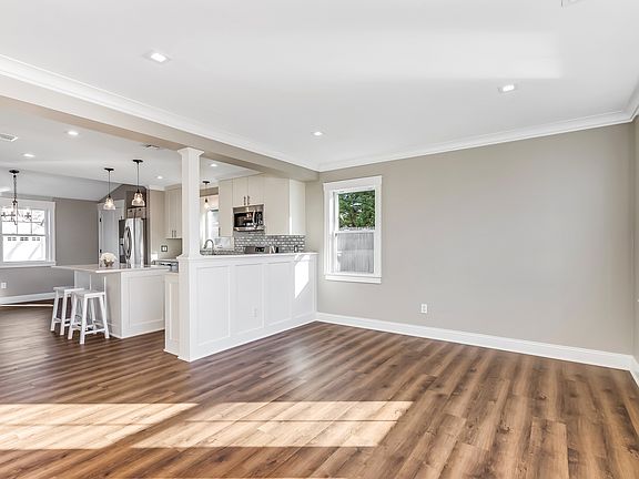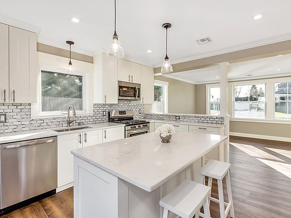 Pristinely renovated Cape Cod home has been meticulously appointed with beautiful finishes, top to bottom. Fresh & bright open floor plan with eat in kitchen, quartz countertops, stainless steel appliances, gorgeous light fixtures & huge windows. Two "magazine-worthy" full bathrooms, four bedrooms, including master w/adjacent bathroom.Detached two car garage with plenty of storage; brand new central air/heat system, gas heat/cooking, new electric/plumbing, radiant heated floors.This is the one!