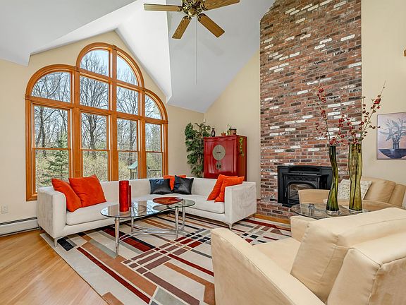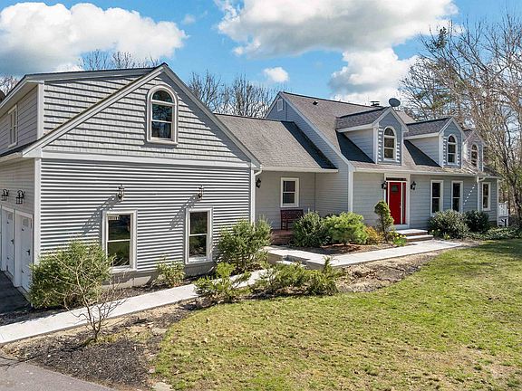 OPEN HOUSE CANCELED 5/5! This distinctive, custom cape is privately tucked off the road on a 9.28 acre lot with a first floor Primary bedroom suite. Handsome leaded glass entryway leads to a dramatic open foyer with gleaming hardwoods. The bright and airy great-room offers vaulted ceilings and custom floor to ceiling window overlooking the wooded setting. You’re sure to enjoy the pellet stove surrounded by a brick fireplace. The formal dining room is complemented by vaulted ceilings, hardwood floors and lots of windows. The impressive custom kitchen has a huge center island with seating areas, built-in China cabinets, an abundance of cabinet space and stainless-steel appliances. There is also a media room tucked off the great-room behind French doors. With crown moldings and hardwoods it could serve as a formal dining room as well. The first-floor Primary bedroom suite features a walk-in closet, beautiful bath with spa tub and atrium style door opening to a private balcony. The second floor offers two spacious bedrooms and a full bath. Off the back hall you’ll find the laundry, pantry and powder room and the stairs to a beautiful bonus room over the three-car garage. There is a spacious multi-level deck and big back yard. Plus you’ll love the energy saving features such as the solar panels. The full basement has daylight windows and walks-out to both the back yard and into the garage. What a great opportunity in the desirable town of Windham.