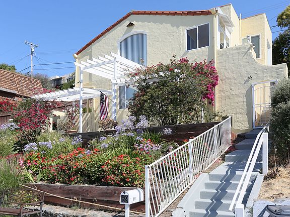 Gorgeous, top two floors 3BR/2.5BA facing San Rafael's Waterfront. The home is accessed via stairs from street level and has a secure door between the street and the unit itself. There is a porch between the stairs and the entrance to the apartment. Large living room has a wood-burning fireplace. It connects to the dining room and central hallway. It has a nice view of the marina across the street. Dining room provides access to the kitchen. Galley-style kitchen includes gas stove, microwave, dishwasher and lots of cabinet space. It has a pantry with shelves. Kitchen has sliding glass doors that open onto the yard. Terraced yard has a concrete-paved area. There are two bedrooms and two full baths on the main, lower floor. One bedroom has a large standard closet; the other has a wall closet with sliding mirror doors. Main bath is in the central hallway near the kitchen. It has shower-over-tub and his and hers sinks. The second bath has a glass shower stall. It is accessed through the second bedroom and is adjacent to the washer and dryer. A staircase leads up to the top floor from the laundry. The top floor is a bedroom with private deck and half bath. The deck is accessed via sliding glass doors and has a view of the marina and Mt. Tam.