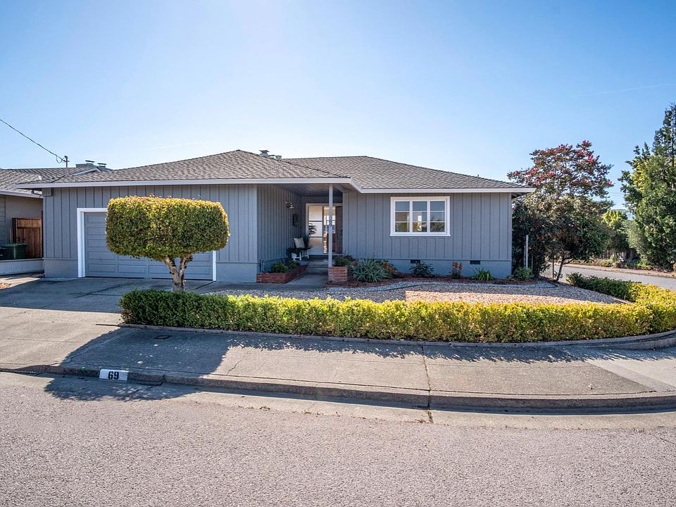 Welcome to 69 Ridgewood Dr., a single-level ranch-style home with 3 bedrooms, 2 baths, and captivating Mount Tamalpais vistas. Nestled on a corner lot in the sought-after Rafael Highlands, this cherished residence has been with the same owner for nearly half a century, and eagerly awaits you, as the new owner, to make it your own! Inside, you will find an inviting open-concept layout boasting hardwood floors, abundant windows, and a charming brick fireplace. The mid-century kitchen seamlessly connects to a spacious dining and family area, ideal for both everyday meals and hosting guests. And a sliding door leads to a private, level rear yard and patio, perfect for alfresco dining or basking in the sun with Mount Tam as your backdrop. The two-car garage offers ample storage space. Located moments away from some of Marin's best hiking trails, Andy's Market, Sun Valley Elementary, and a wealth of fine dining options in San Rafael's West End. 69 Ridgewood is more than a house; it's your Marin dream come true. Welcome home!
