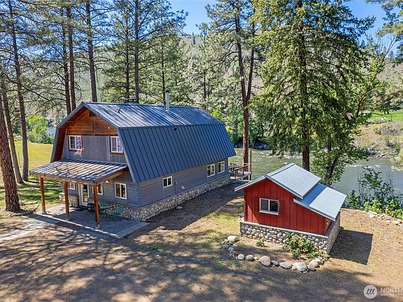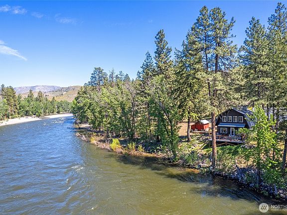 Methow River home surrounded by Ponderosa pines, Guest/Rec Bldg (which sleeps 6 with full bath), wine/root cellar, and bonus Bldg on 4.3 acres with 1100 feet of frontage on prime trout water! Quiet paved road, established neighborhood. Large primary bedroom with cozy stove and wall of windows looks down into river; watch Goldeneyes fish below the surface. Living/dining room with windows on three sides offers view of river and hills. Natural stone fireplace, wood stoves, large shaded riverside deck. Guest/Rec Bldg has room for ping pong, foosball, movie, workout areas & has large workbench. From the deck, feet from the river, watch ospreys swoop for trout. Medium-bank access features sandy beach for fishing, rafting, swimming. Fruit trees.