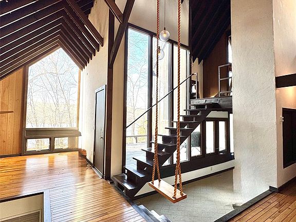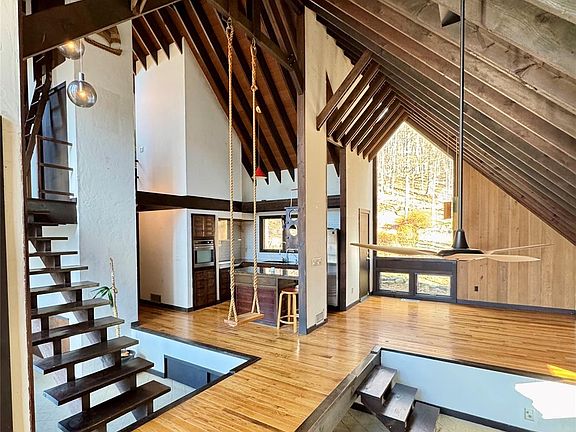 SWING into this true architecturally striking mid-century modern gem. This 1192 square foot home has elevated walkways that lead you through the home as soaring ceilings, exposed woodwork, and dramatic floor to ceiling windows frame the surround landscape. Light from every angle makes this home feel like moving art in nature. Many of the home's original features have been beautifully preserved offering a rare chance to own an MCM style home. The open airy layout gives peaceful views from every room. In the middle of the home sits the original swing, a charming playful spirit of the era.