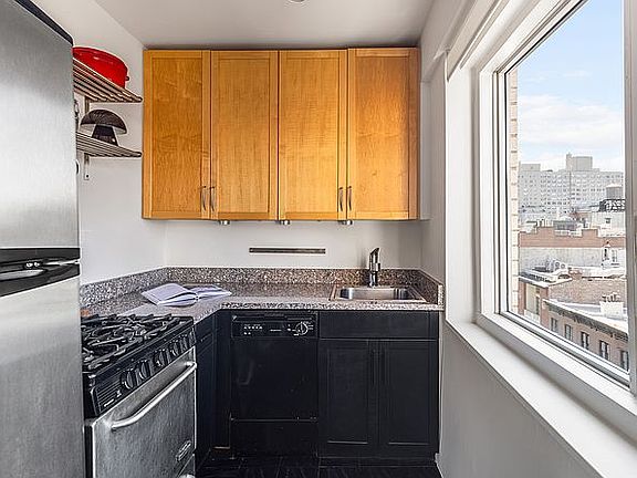 From the moment you enter the foyer, you’re welcomed by a dramatic wall of windows that fills the home with natural southern light and frames sweeping views of downtown Manhattan. The expansive living and dining room easily accommodates both a generous seating area and a dedicated dining space, all while maintaining an airy, open feel. The windowed kitchen is outfitted with full-size stainless steel appliances, including a gas range and dishwasher, and offers abundant cabinet space.