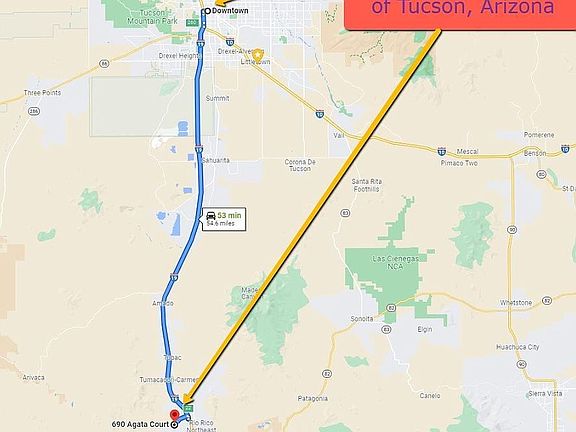 Great 0.58 acre hilltop property west of I-19 in Rio Rico, Arizona Address: 690 Agata Ct, Rio Rico, AZ 85648 Come take a look at this 0.58 acre hilltop property in Rio Rico, Arizona. Seller will consider all offers! Located a few minutes West of I-19 in a beautiful area with very few neighbors around. Surrounded by endless outdoor activities, whether it's swimming and boating at Patagonia Lake State Park, playing golf at one of the courses in the area, hiking and biking the miles of trails available or just relaxing and going sightseeing. This property has great mountain views and awesome Sonoran Desert sunsets situated in this quiet rural setting. In nearby Tubac AZ there is shopping, fine dining, museums, art galleries and entertainment for the whole family, Walmart Supercenter 23 minutes away in Nogales AZ., Tucson is less than 1 hour North with endless amenities available.