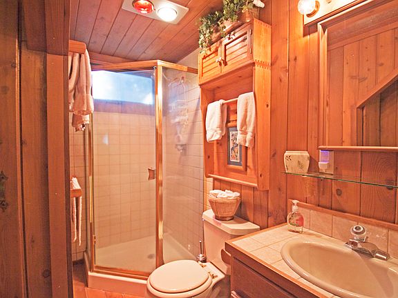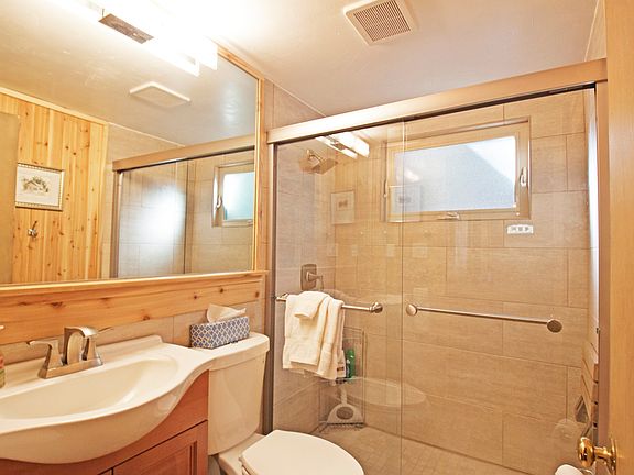 Downstairs you'll find the kitchen/dining room, laundry room, living room, full bathroom with walk-in shower stall (newly remodeled) and one bedroom with double bed; upstairs you'll find the other two bedrooms, one with a king size bed, the other with a king size bed and a twin. There's also one full bathroom with shower stall.