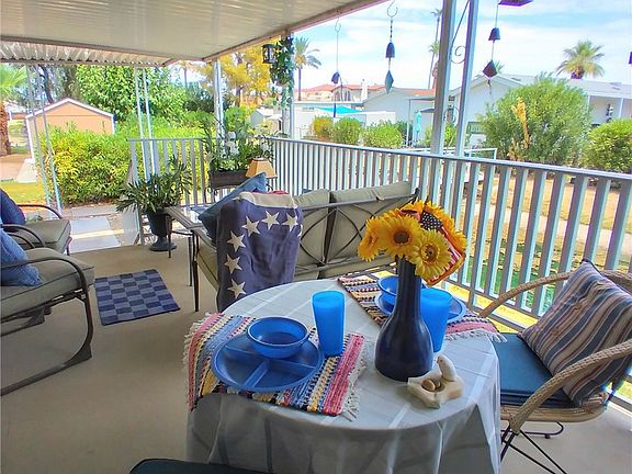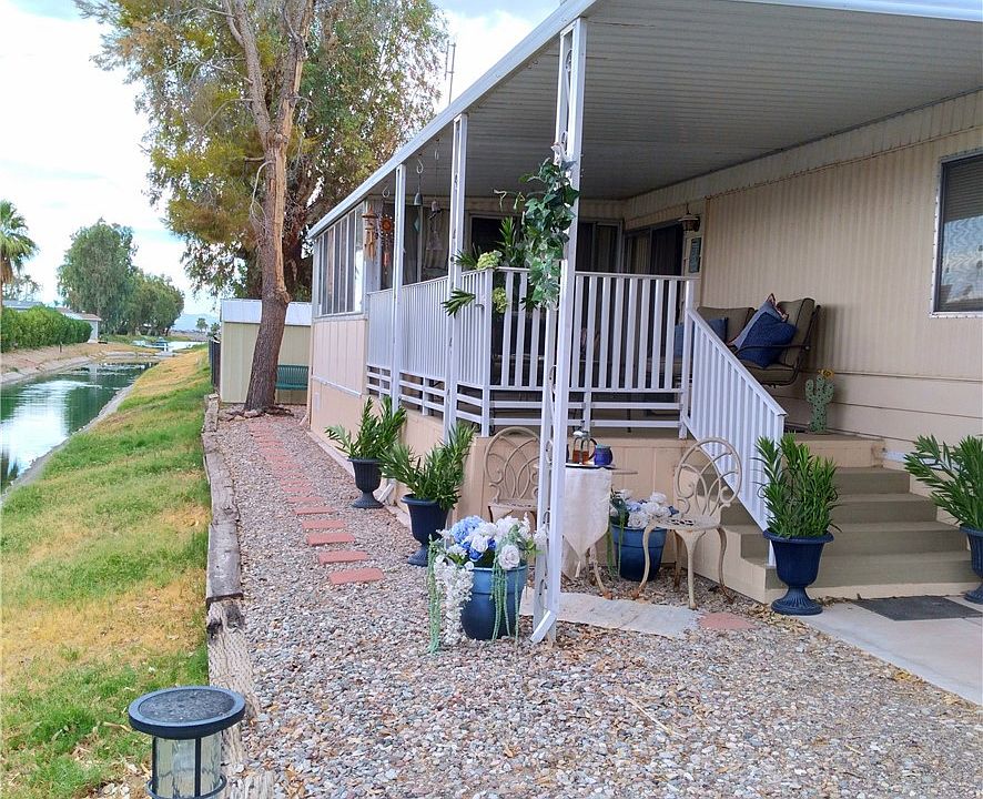 SMOKIN' DEAL IN DESIRABLE 55+ RIVERFRONT MH PARK ON THE COLORADO RIVER. Move-in Ready 2 bedroom/2bath single-wide on greenbelt waterway · Steps from the Colorado River · 2 private launch ramps, courtesy dock, grassy tree-studded parks, sandy beaches · Golf-cart-close to River’s Edge Golf Course with Restaurant & Bar · Fishing, boating, watersports, off-roading at your doorstep · Includes furniture, all-electric appliances, washer/dryer, accessories, kitchenware, w/no warranties · Single-level indoor-outdoor living w/9-1/2' x 16' covered deck & 9' X 15' sunroom in addition to the 768+/- SF for a total of over 900SF of interior living space plus over 150SF of deck under roof · Shaded carport for multiple vehicles · Boat parking in oversized extra carport · 8x10 shed · Rear garden area next to water feature · Full-time year-round or vacation living · Privately owned 55+ park · ground rent only · no HOA · Buyer must qualify for park residence · MOTIVATED SELLER