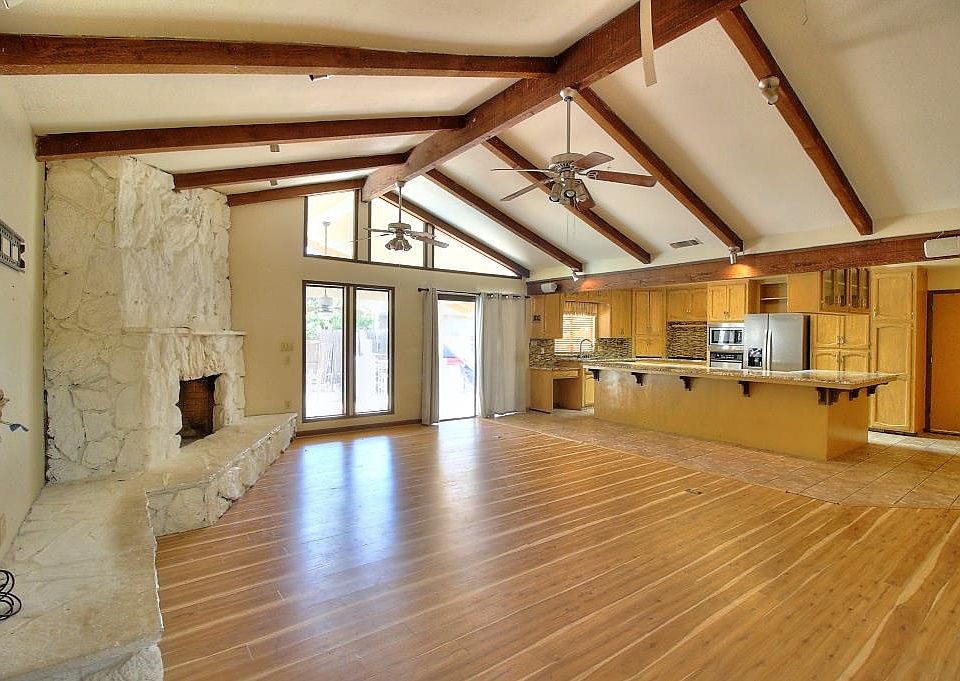 Entertainer's Dream! This custom-built home offers over 2,000 sq ft of thoughtfully designed living space, perfect for hosting unforgettable gatherings. Step into the spacious Great Room featuring vaulted beam ceilings and a stunning floor-to-ceiling rock fireplace. The show-stopping kitchen boasts a live-edge granite island with bar seating, skylight, Jenn-Air indoor BBQ cooktop, Bosch dishwasher, gas wall oven, and an adjacent formal dining area with room for eight. Enjoy privacy-tinted windows, double-sided privacy fencing, and a sparkling inground poolcomplete with a nearby covered dining area and convenient pass-through window. Additional highlights include new laminate flooring in the main living areas, a 7-year-old roof, a 6-year-old pool filter, and a dedicated office or den. This unique property truly has it allcomfort, character, and room to entertain!