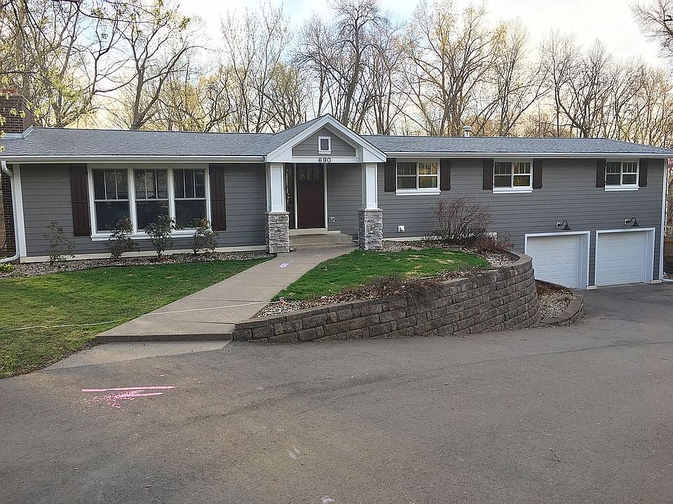 Large kitchen with granite counters and stainless steel appliances, cherry cabinets. Living room, dining area, and 5 bedrooms on main level. Large master suite with walk-in closet and private bath, access to expansive 40x15 deck. Two working fireplaces, large private backyard surrounded by mature trees. Finished walkout basement has family room, wine cellar, 3/4 bath, non-regulation 6th bedroom, and laundry room with storage. Behind garage is a large workshop room and additional storage room with access to backyard.