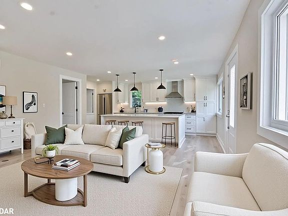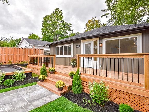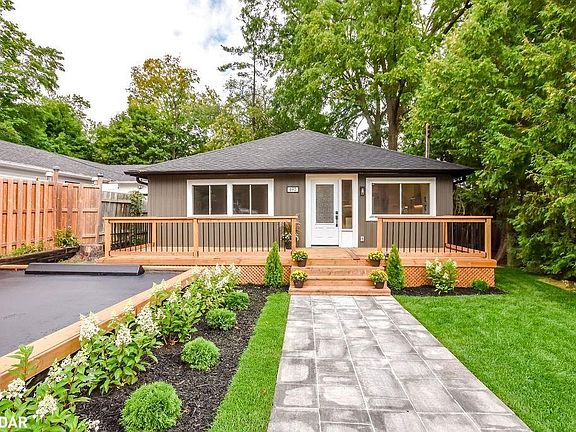 Welcome to this charming bungalow, perfectly located just a short walk from Lake Simcoe, Innisfil Beach Park, and the Innisfil Boat Launch. Set on a large, private lot in the desirable community of Alcona, this home offers both the serenity of lakeside living and easy access to Hwy 11 & 400 for a quick commute. Inside, the bright and spacious open-concept main living area is highlighted by a cozy gas fireplace and flows seamlessly into a beautifully renovated kitchen. Designed with both style and function in mind, the kitchen features solid wood cabinetry, a large island with waterfall quartz counters, under-cabinet lighting, pot lights, and stainless steel appliances. The primary bedroom includes a walkout to the new deck, while the updated bathroom and additional bedroom provide comfort and convenience. Extensive updates throughout the home include new shingles, plumbing, electrical, heat pump, bathroom, kitchen, deck, and fresh landscaping. The expansive yard offers endless opportunities to relax, entertain, or enjoy family time outdoors. Whether you’re looking for a year-round residence or a weekend retreat, this property combines modern updates with the best of lakeside living. This home is truly a must see! Some photos have been virtually staged to to show potential