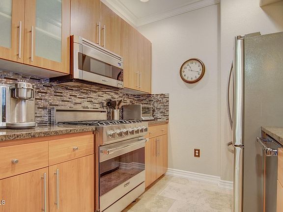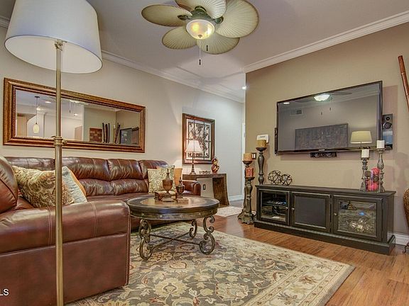 Turnkey fully furnished opportunity! Step into luxury with this impeccably updated condo with thousands in upgrades, evoking the timeless elegance of an Italian villa. Both bathrooms feature exquisite travertine tile on floors and walls, creating a warm, Tuscan-inspired ambiance. The gourmet kitchen boasts premium Viking stainless steel appliances, granite countertops, and a reverse osmosis system, paired with rich wood flooring in the adjacent eating area. A new Bosch washer and dryer add modern convenience. This home is move-in ready with a new HVAC system, water heater, and thoughtful upgrades throughout. Hardwood floors grace both bedrooms, complemented by plantation shutters, contemporary drapery, blackout blinds, crown molding, and oversized baseboards in every room. Custom California Closets maximize storage, while ceiling fans ensure comfort throughout. The living room is an entertainer's dream, featuring a 5.1 surround sound system and a 60" flat-screen TV, furnished with a stylish leather reclining L-shaped sectional, a modern wrought iron coffee table, and coordinating end tables. The master suite elevates relaxation with a king-size bedroom set, a large flat-screen TV with a soundbar and wireless subwoofer, ideal for immersive movie nights. The second bedroom offers a queen-size bedroom suite, a 50" wall-mounted flat-screen TV, and a spacious closet organizer. Perfectly situated directly across from a multimillion-dollar clubhouse, residents enjoy access to a resort-style pool, state-of-the-art gym, espresso bar, computer room, kitchen, grand piano, fireplace, and a dedicated movie room. This prime location is steps from fine dining, a movie theater, grocery stores, Mayo Clinic, Barrett-Jackson Auto Auction, and the renowned TPC Phoenix Waste Management Open. Experience luxury, convenience, and an unparalleled lifestyle in this exceptional home.