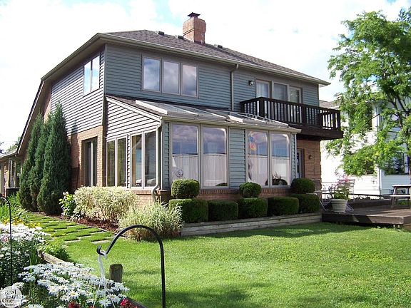 Just South of Marine City, Along the St. Clair River you find this captivating 3 bedroom, 3 bathroom 2814 square foot home on a 1768 square foot basement. The 1st floor of this home boasts a first floor primary bedroom with bath, a second bath with shower for a quick change after taking a swim in the river, a spacious kitchen with snack bar, a formal dining room flowing right into the living room that has a natural gas fireplace to cozy up to on a cool fall day. The living room features a full wall of built in cabinets with a fireplace in the middle of them. This natural gas fireplace has lights along the top over the glass shelves. What a peaceful setting to unwind and relax after a long day. Looking out the front of the living room you will look through to the 3 season room which overlooks the St. Clair River and passing ships from many lands. From the hall near the dining room you will approach a wide wooden stairway going to the upstarirs. Upstairs there are two bedrooms and another full bath with a soaking tub and a seperate shower. One of the bedrooms is currently being used as a home office. You will be delighted to know that this bedroom has doorwall that opens to a balcony overlooking the river offering a great view of passing ships and activity on the river. Also upstairs you will find a bonus room that can be finished off or used for easy access storage. Something you will note as you go through this well maintained home is that there are plenty of closets and cabinets for storage. The basement has a game room, office or living space, storage room, mechanical room where you will find a sump pump system with a back up sump pump and a workshop area Outside the 3 season room you will notice that there is a large deck for picnics, centertaining and more. Oh! you will find that the waterfront has a steel seawall and a covered 30x30 enclosed inland boathouse wih 2 Algonac Hoists that is grandfatered in. (This means that as long as you leave one wall it can be rebuilt). There is a deck by the boat house for ease of putting your lawn furniture out to watch the waterfromt activity and boats from many lands pass by your property. The home has interuptive C/A service which gives you a discount on usage. There is a direct hook up for a generator hook up plug outside the side access door. There are irrigation lines through the yard for use in watering the lawn etc. Water is pumped from the river for these lines. The water pump will be in the garage. Excludes appliances not listed. Let's head to the other side of the home facing the road where you will see an attached 2.5 car garage as well as a detached 2 + garage and workshop. This garage has a newer gas hookup line for a gas space heater in garage, an RV electrical hookup on the back of the garage as well as extras guest parking Note H2O was new November of 2024.