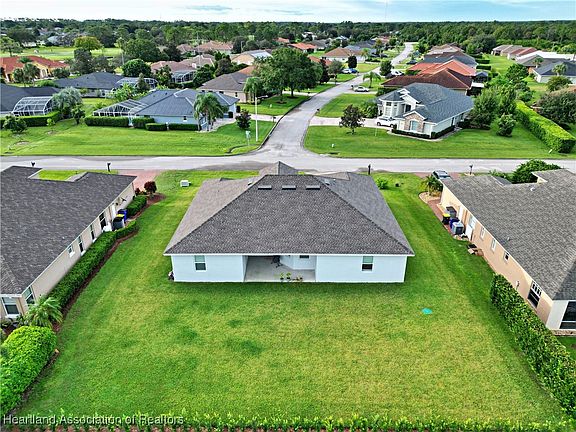 4-bedroom, 3-bath single-story in the Sun ’n Lake community of Sebring featuring an airy open-concept layout anchored by a modern kitchen with espresso shaker cabinetry, granite countertops, a raised breakfast bar, stainless steel appliances (smooth-top range, microwave, dishwasher), and a high-arc faucet; the kitchen flows into a generous living area with a statement chandelier, a TV-ready wall, and sliding glass doors to the backyard for easy indoor–outdoor living; durable tile in the main areas and a light neutral palette keep the home bright and low-maintenance; the bathroom finishes include a coordinating dark-wood vanity with a solid-surface top and tile; a covered front porch with columns, two-car garage, and wide driveway add everyday convenience; centrally located near Sun ’n Lake amenities, shopping, dining, medical facilities, parks, golf, and the area’s lakes with quick access to major local routes across Highlands County.