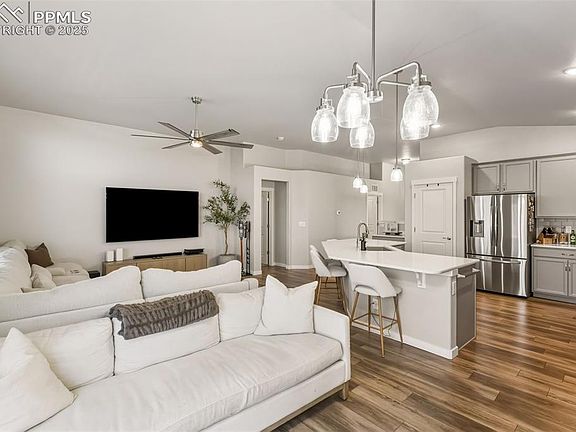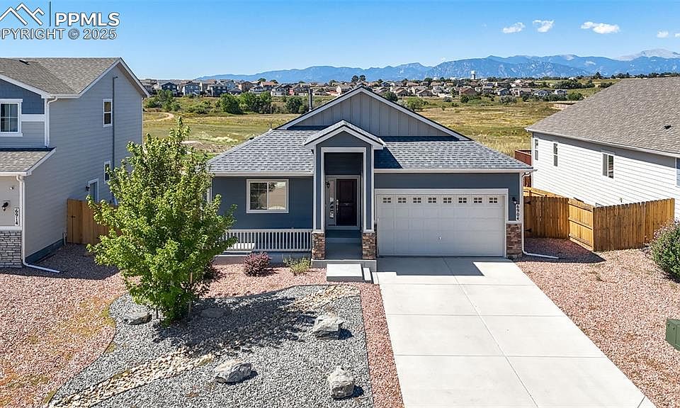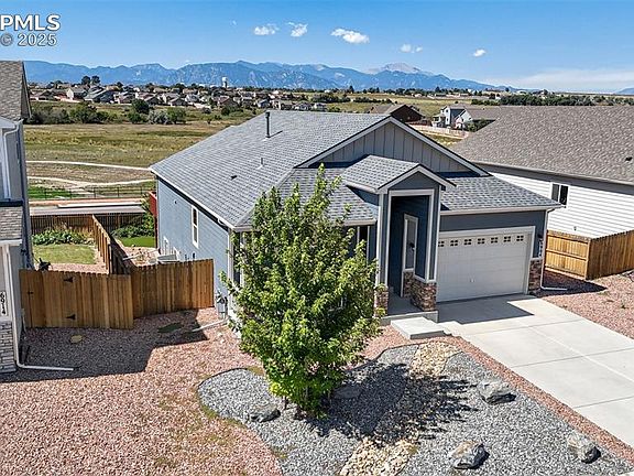 A brand new Class 4 impact resistant roof installed 10/26/24 means peace of mind and potential annual insurance discounts for the lucky new owner. Pair that with premium artificial turf, zero maintenance landscaping, and stamped concrete in both the garage and front patio finished with Rhino-lining for extra safety in the winter, and you’ve got style and durability from the ground up. Step inside to soaring ceilings, walls of windows, and wide open mountain views that flood the main level with natural light. The chef’s kitchen is both sleek and functional, featuring fingerprint resistant Samsung appliances including a double oven, an oversized island, tall 42-inch cabinets, and a pantry you’ll actually be excited about. The main level primary suite keeps life easy with a spa-worthy bathroom that includes a soaking tub, dual vanities, oversized linen closet, and a massive 10x10 walk-in closet you’ll want to brag about. Conveniently placed nearby are the laundry room and two additional bedrooms. Step out from the dining area onto your freshly stained deck and take in unobstructed, jaw-dropping views of Pikes Peak. Downstairs, the garden-level walkout basement is ready for whatever you need—think family room, gym, playroom, or all three. You’ll also find two oversized bedrooms with walk-in closets, a double vanity bath, and a huge utility and storage space complete with water softener, humidifier, and upgraded PEX plumbing. All this, just 5 minutes from groceries, Starbucks, and everyday essentials, and 10 minutes from Fort Carson, Peterson AFB, and Schriever AFB. This isn’t just a house. It’s a smart investment with comfort, convenience, and Colorado beauty built right in.