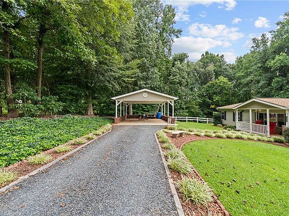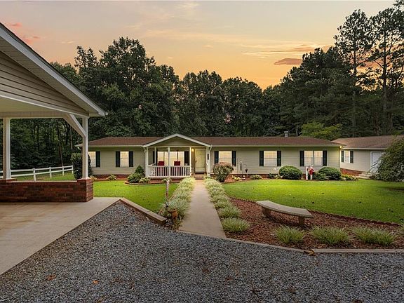 Welcome to 6904 Campbell Rd in Pleasant Garden – a peaceful country retreat offering over 2,000 sq ft of living space on 11.05 private acres. This well-maintained home features 3 bedrooms plus a versatile bonus room, a large den, and a separate living room. A small pond sits beside the home, and the spacious deck overlooks beautifully landscaped grounds with mature beds and open acreage. All appliances convey, and the home is equipped with a hardwired AI Power 12,000-watt generator for peace of mind. Exterior improvements include a detached 2-car garage with matching vinyl siding, 2-car carport with lights and paved slab, three storage buildings, two sheds, an 18x21 tractor shed, and a 12x26 camper shed. The property is located at the end of a well-maintained gravel road, offering privacy while remaining convenient to major highways—approximately 10 minutes to I-85, 15 minutes to I-73, and 20 minutes to downtown Greensboro. Neighboring farmland and pastures add to the serene setting.