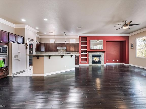 Welcome to this stunning one-story home in a secluded Aliante community. The property is nestled on an oversized lot with mature green landscaping surrounding the home. An elegant courtyard entrance separates the main house and the casita. Once inside the floor plan is notably open with beautiful wood flooring and cozy fireplace in the great room. Kitchen features include: granite countertops, custom cabinets, a large island and recessed lighting. Bedrooms are generous in size and with brand new carpet. Elegant details include crown molding, two-tone paint, and a primary bath with a marble-finished vanity. The second bathroom has dual sinks, and the laundry room provides a sink and extra storage. The private casita is a perfect space for guests or an office. The backyard features a covered patio and ample room to play, garden, or entertain. The home is in great condition and move in ready for its next owner. Schedule you private tour today!
