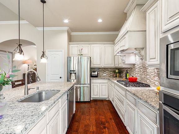 This Stone Hollow home offers a perfect blend of luxury, style and comfort. Located within walking distance to prestigious Frisco elementary school and just minutes from shopping, restaurants, and easy access to SH-121. Step into the tranquil backyard and relax beneath the covered patio, a serene retreat from the hustle of daily life. Enjoy a family gathering, grilling, with easy access to the dining area and kitchen, making entertaining a breeze. Inside, you’ll find an open floor plan bathed in natural light highlighting the neutral paint selection and dark hardwood flooring all creating an inviting ambiance, while the gas log fireplace adds a touch of coziness for winter evenings. The spacious kitchen is equipped with a walk-in pantry, gas range, convection oven, and a large island perfect for meal prep, serving, or supervising studies and crafts. The adjacent dining room is designed for intimate family dinners or hosting larger gatherings. The primary suite is a luxurious haven with views of the backyard and features a walk-in closet, a garden tub, walk in shower and an expansive vanity with dual sinks. The ground floor includes a dedicated office with French doors for privacy, a generous laundry room, and a half bath for guests. Upstairs are a plushly carpeted game room and a separate media room for movie nights along with two bedrooms and a full bath. Upon entering the home you'll recognize the attention to architectural detail and beautiful lighting, and numerous spacious closets. This property also features a front-entry two-car garage. Come explore this remarkable home and discover the vibrant amenities of the neighborhood at Stone Hollow in McKinney. Don’t miss your chance to call this exceptional property your new home!