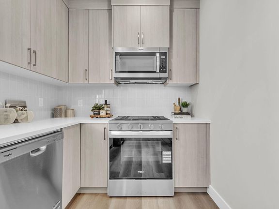 Warm wood cabinetsStainless appliancesTile backsplashVinyl plank floorsPrivate balconyTranquil primary bedroomsAmple closet spaces