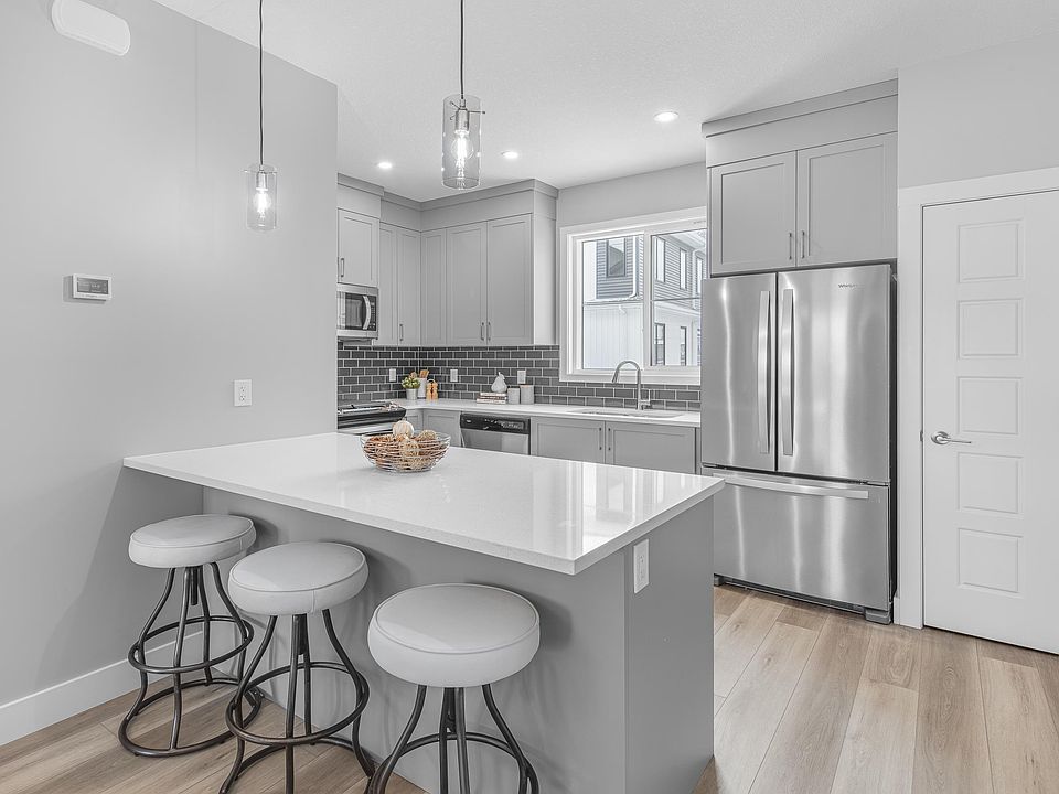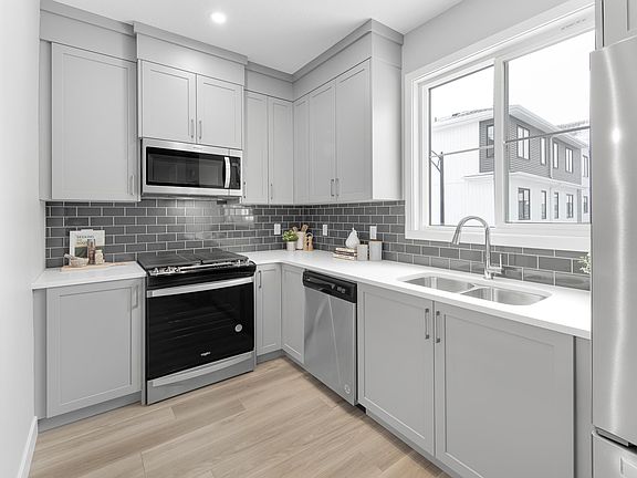 Discover the Gillespie 2 at The Everly, where modern living meets suburban charm. Spread across 1130 square feet, this two-bedroom row townhome, each with its own ensuite, is designed to bring comfort and style to your life. Experience the convenience of a two-car tandem garage along with a formal front entry on your lower level. Step into an open-concept dining and living area, the perfect space for entertaining guests or relaxing with family. Let the sunshine in with a private balcony, the ideal place for your morning coffee or an evening barbecue. More than just a home, the Gillespie 2 at The Everly is a way of life. The Orchards is a vibrant, family-friendly community in southeast Edmonton, this home provides access to an abundance of parks, ponds, and walking trails. Residents also enjoy exclusive access to a private 8-acre clubhouse featuring amenities for all ages, including a spray park, NHL-sized skating rink, playgrounds, tennis and basketball courts, and so much more. *photos of showhome