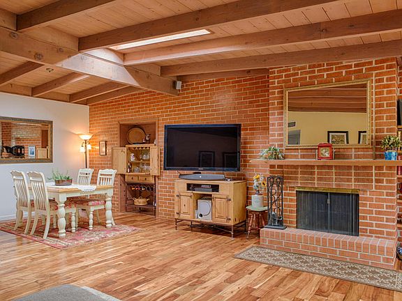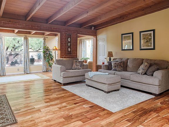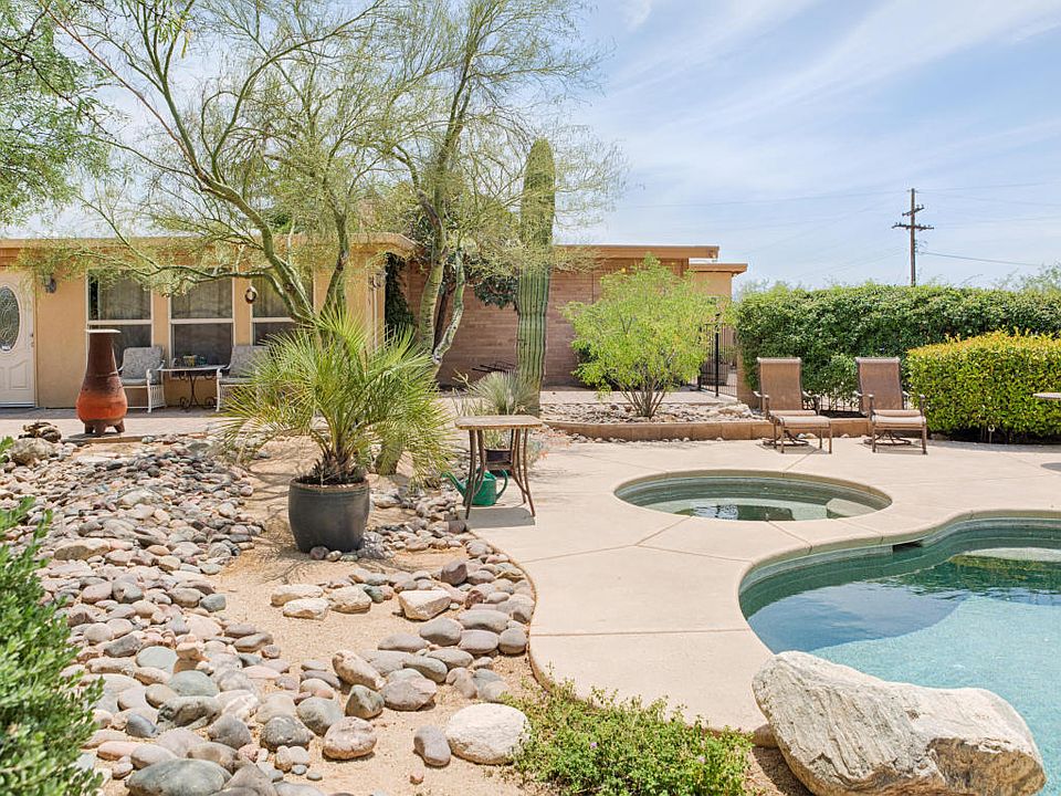 Quaint, Charming, Comfortable and Inviting all describe this wonderful brick home that sits on almost an acre of lush desert vegetation which includes many citrus (Oranges, Grapefruit, Tangerine and Lemon). This home has been remodeled while keeping its old world charm. Beamed ceilings, wood floors, charming sun rooms front and back, dual pane windows, newer HVAC system and skylights. Enjoy the privacy of a split bedroom floor plan. Master wing hosts bedroom, bath and office. Gourmet kitchen gives you what you need to be creative. Enjoy your gated pool/spa area. Pool/Spa is pebble tec with rock features and has newer variable speed pump for energy efficiency. Relax out back on your covered paver patio, enjoy watching the kids or pets play on the grass. Come discover this surprise today!