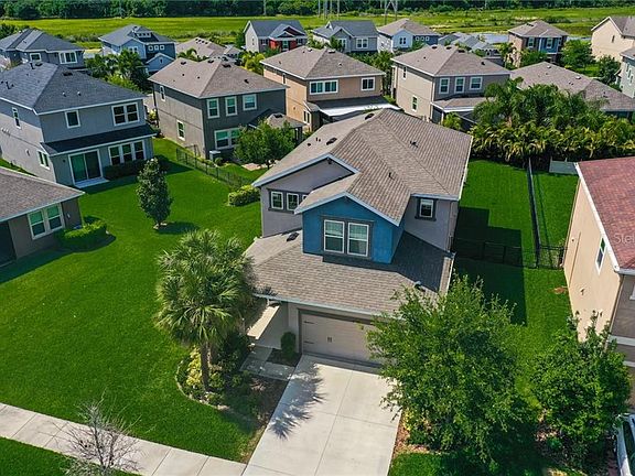 Another Beautiful Waterset Home for sale with 5 bedrooms, 3 baths, 2 car garage 2400 sq ft. , fully screened-in lanai and a fully fenced-in backyard with a lovely wooden trellis swing set. Hard wood look tile floors throughout the entire first floor with a massive family room, one bedroom and a full bathroom on the first floor, beautiful and spacious kitchen with tall 42" cabinets, SS appliances, double door refrigerator and gas oven/range, beautiful mosaic tiled backsplash. All other bedrooms are upstairs with a spacious inviting master suite. Master bath has dual sinks, a walk-in shower and a garden tub. The loft opens up to Bedrooms 2,3 and 4, sharing a Full bath. Homeowners in Waterset have many amenities to enjoy such as 3 community pools, 2 fitness centers, cafe, clubhouse, splash pad, dog park, running trails and much more.
