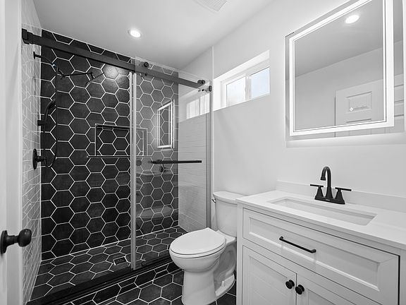 2 bathrooms with black hex tile, walk-in showers, LED mirrors, and black matte finishes